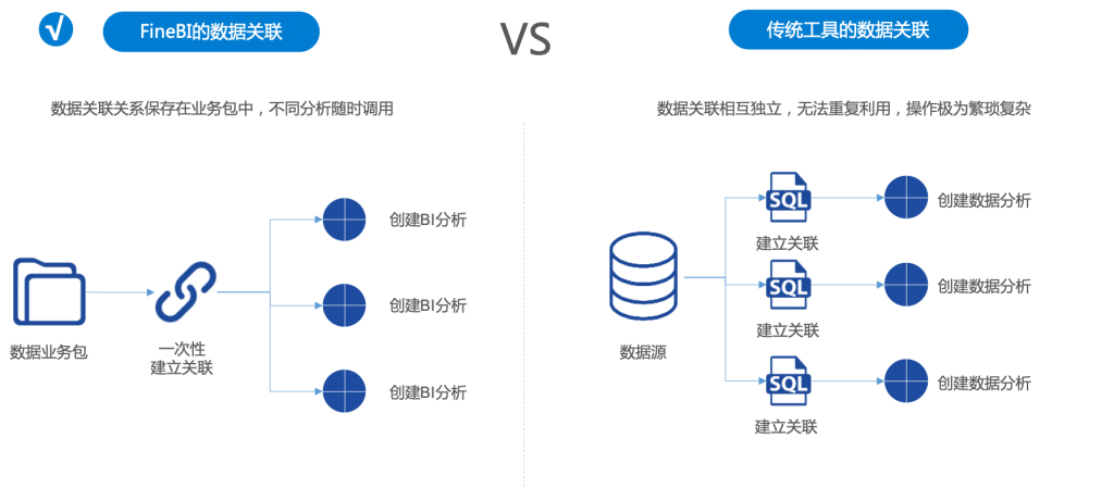 - 1. 多种关联方式:业务包建立后,后台自动建立全局表间关联关系。 也可以选择表字段进行手动关联。有关联的字段在后续的分析中,可自动联动。业务人员可只需选用字段